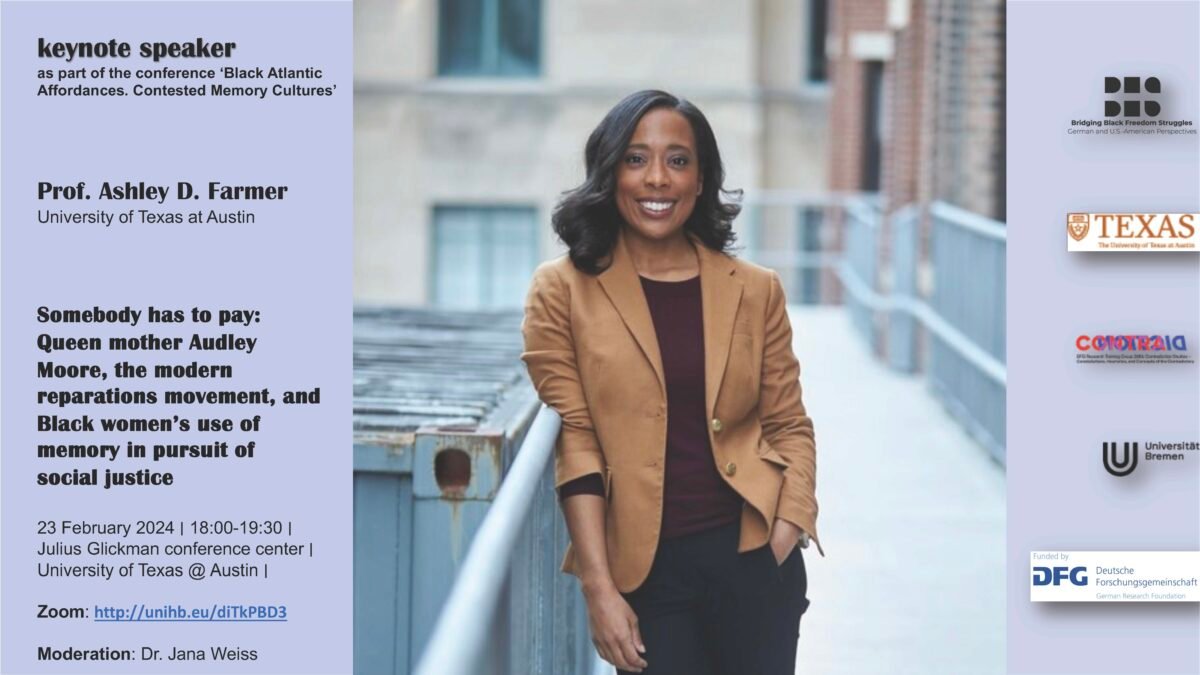 Dr. Deborah Nyangulu and Dr. Jana Weiss convened the ‚Black Atlantic Affordances. Contested Memory Cultures` conference at the University of Texas at Austin from Feb 23 – 25. The event featured a range of speakers who engaged with, among others, questions of Black freedom, memory cultures, , the Black radical tradition, African diaspora, and digital humanities. Prof. Dr. Ashley D. Farmer (UT Austin) and independent researcher, writer, and political analyst Nanjala Nyabola gave the keynote addresses. The conference also featured a roundtable on the topic of ‚Black Atlantic Affordance and Digital Humanities‘ with speakers Kelly Baker Josephs, Justin Dunnavant, Amani Morrison, and moderated by Deborah Nyangulu.